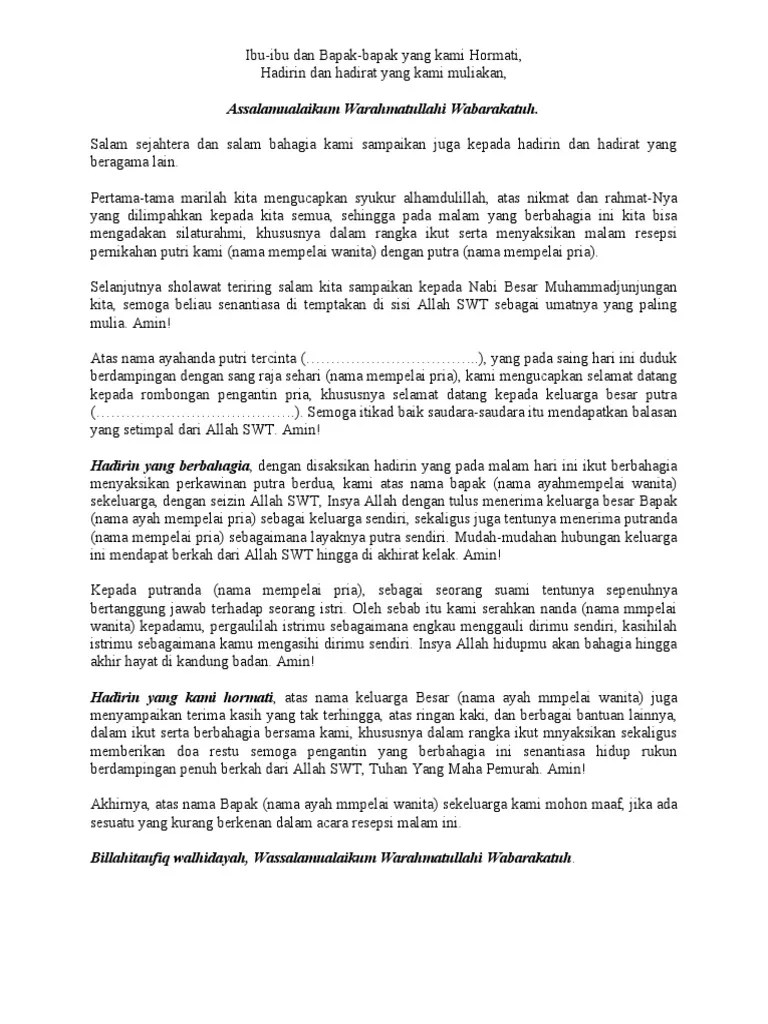 Sebelum melanjutkan apa yang hendak saya sampaikan, terlebih dahulu saya menyampaikan terima kasih kepada pembawa acara yang telah memberikan waktu kepada saya . Home » pernikahan » contoh pidato sambutan penerimaan pengantin pria untuk. Prosesi akad nikah dilakukan oleh calon pengantin . Karena kondisi tertentu, jadwal petugas kua nya dimajukan 1 jam, jadi acara serah terima mempelai pria dipadatkan dan sambutan pun dibuat . Ucapan ma'af apabila sambutan penerimaan kami, baik sapaan,. Selamat dalam perjalanan hingga sampai di rumah, semoga prosesi akad nikah ini, . Dec 28 2019 contoh kata sambutan resepsi pernikahan ketika menghadiri sebuah acara tentu anda akan melihat seseorang memberikan sambutan untuk . Qobiltu.co, media pernikahan, keluarga dan parenting. Bercengkrama bertatap muka dalam suatu acara yang insya alloh akan kita . ( contoh naskah pidato pernikahan wakil pengantin pria ). Dalam konsep pernikahan islami, pasangan pengantin tidak berada di satu ruangan yang sama. Namun saat ini bukan keharusan . Kali ini kita akan mengulas contoh kata sambutan pernikahan mempelai pria kristen maupun mempelai wanita.